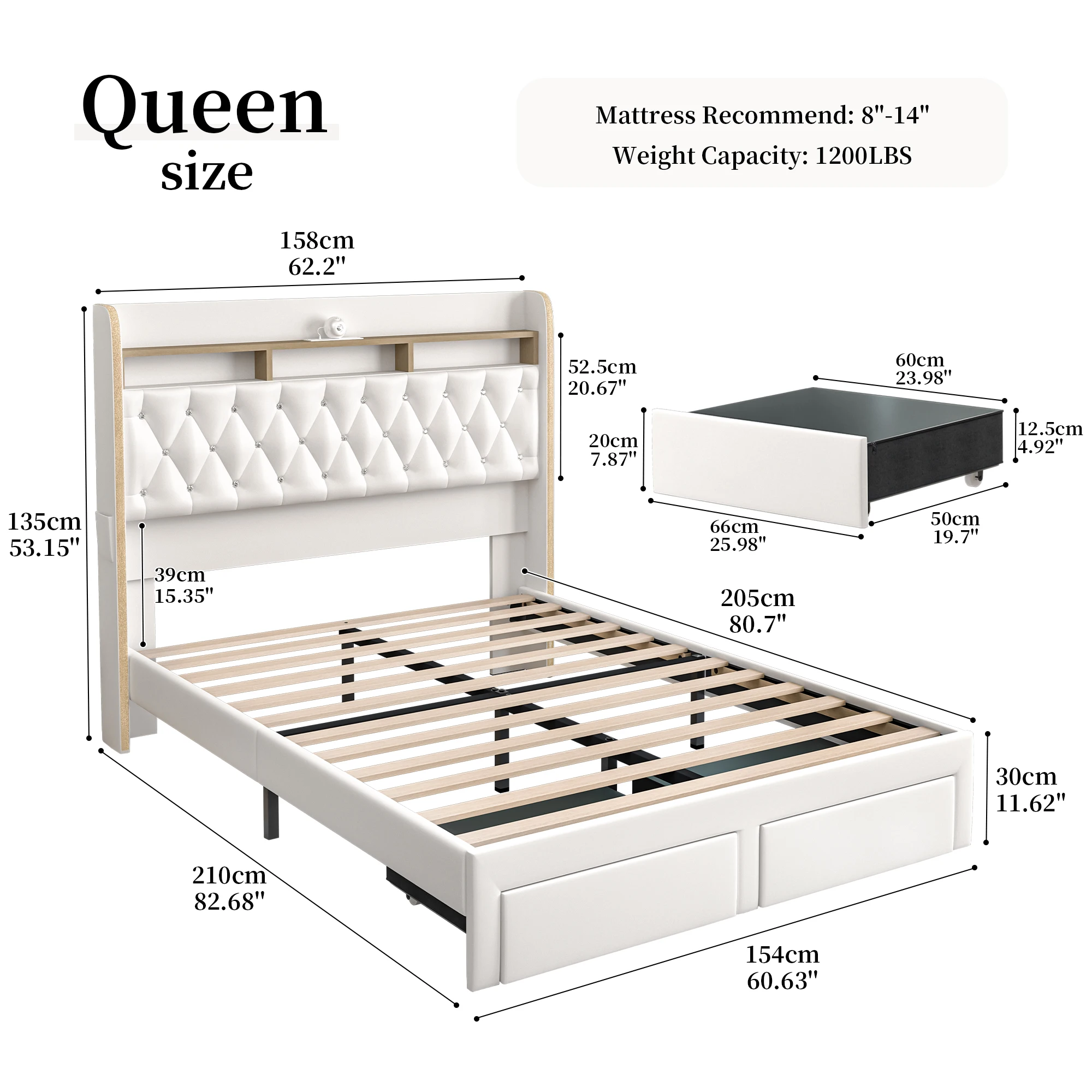 Queen LED Bed Frame with Storage, Star Projector, Charging Station, 2-Tier Headboard, PU Leather Bed